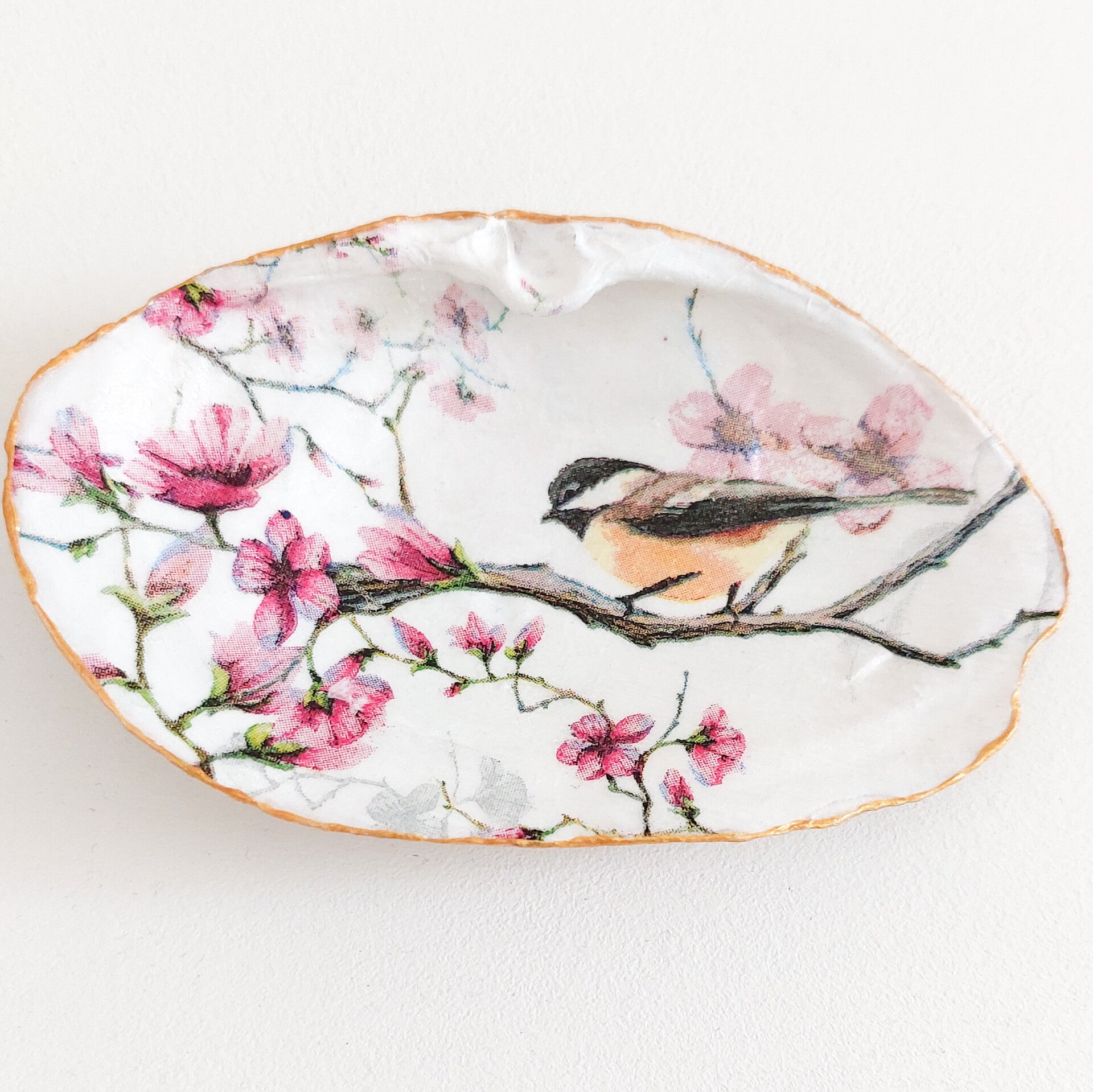 Schelpen bewerkt met decoupage. Deze set van twee otterschelpen en een oestertje heb heb voorzien van een witte ondergrond en daarna heb ik deze afbeelding van de bloesemtakjes en het koolmeesje aangebracht.