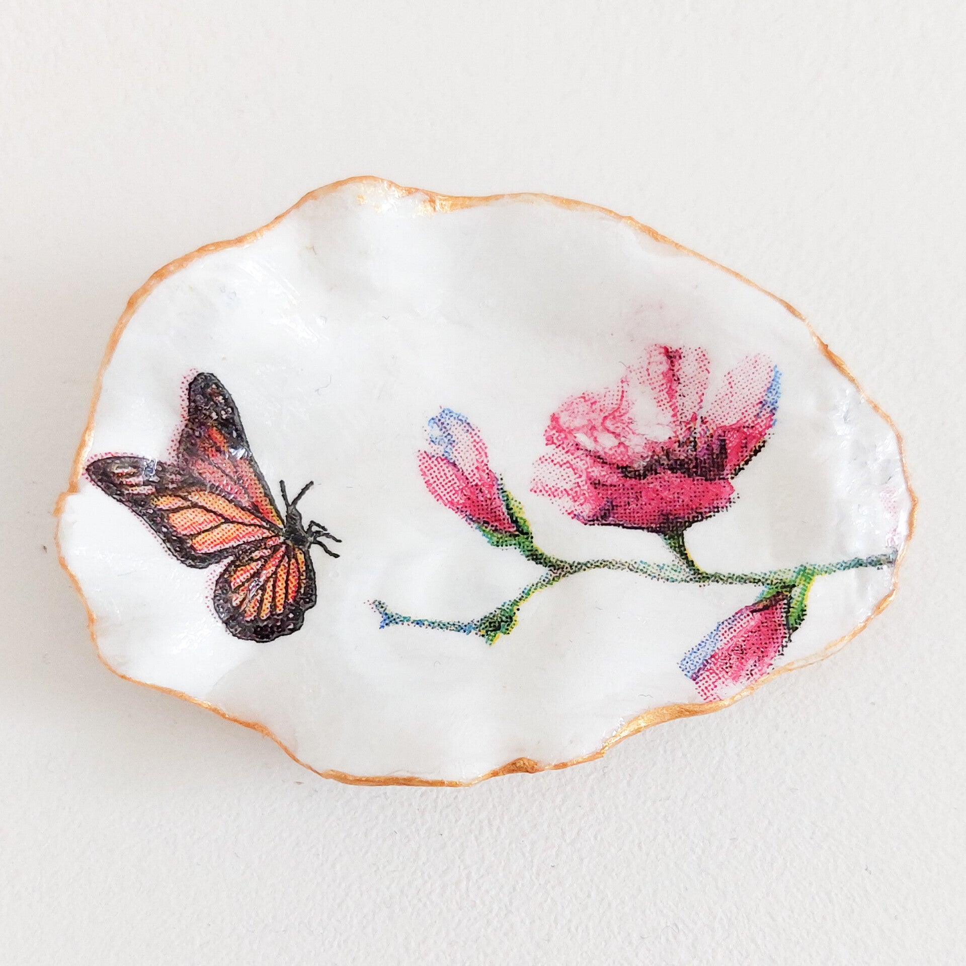 Na het beplakken heb ik de schelpen voorzien van een subtiel randje goudverf. Vervolgens zijn deze mooie schaaltjes voorzien van een laagje glanzende vernis zodat het ook af te nemen is. Dit schaaltje kan gebruikt worden voor sieraden, als bonbonschaaltje of gewoon decoratief. De maat van de otterschelpen is 11,5 x 7 en 11 x 6 cm en de oester is 6 x 4 cm.